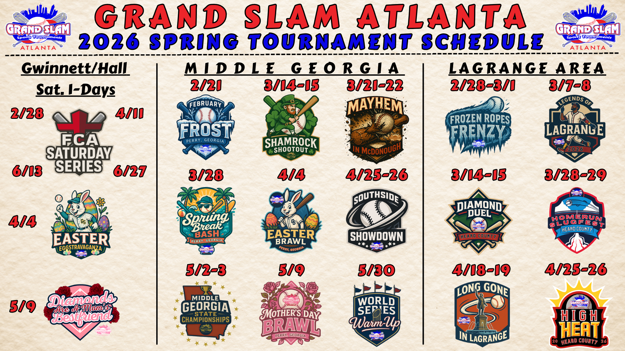 *The first three teams to register in each age group will receive $100 off their entry fee for the Grand Slam Atlanta Opening Day, the 24th Gwinnett/Hall Shootout, and the Al Bishop Park event May 2-3.